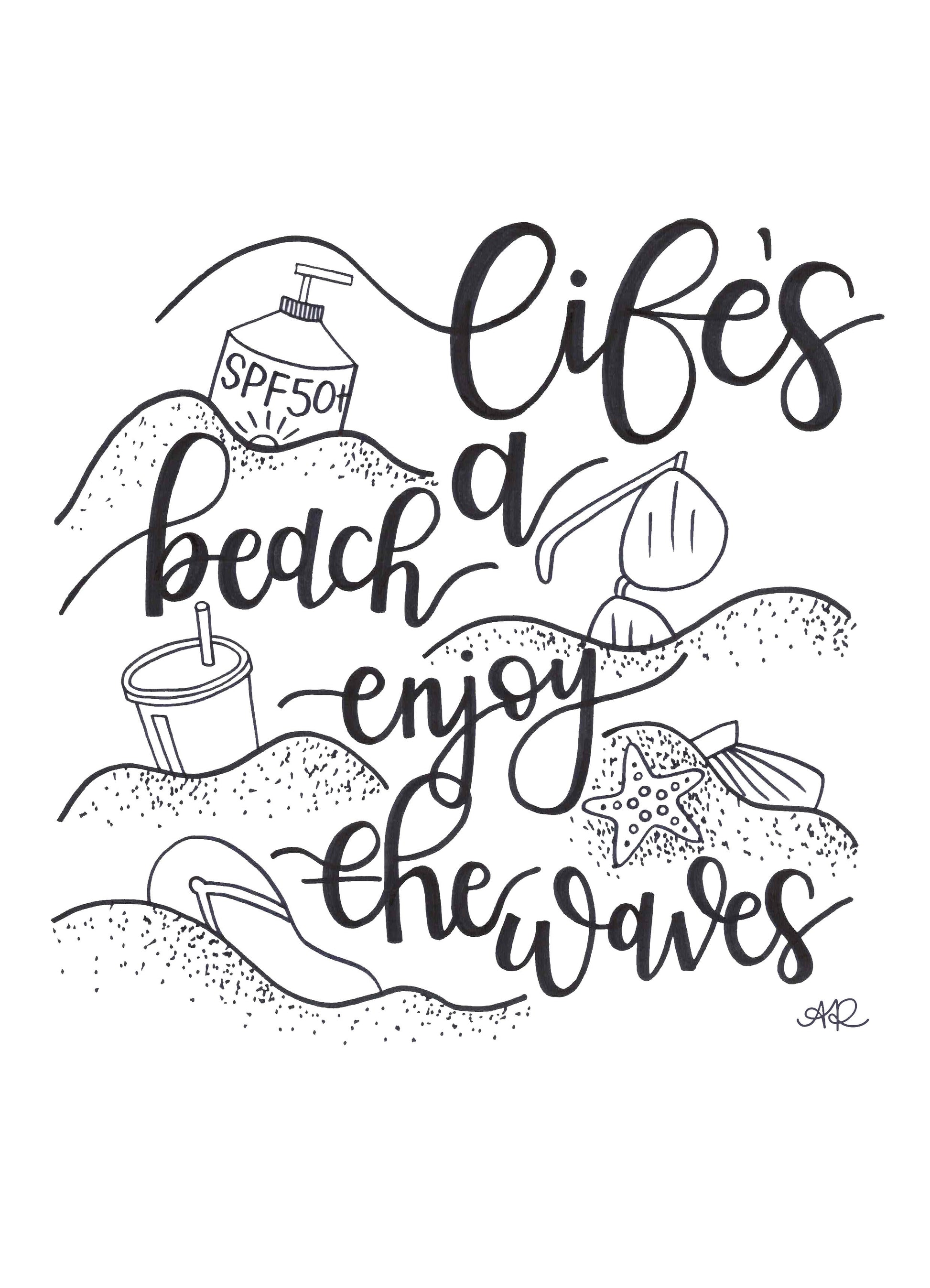 A beachy page to colour, with space around to add your own beach doodles! Perfect for the summer months. A page for any age to keep cool and colour!