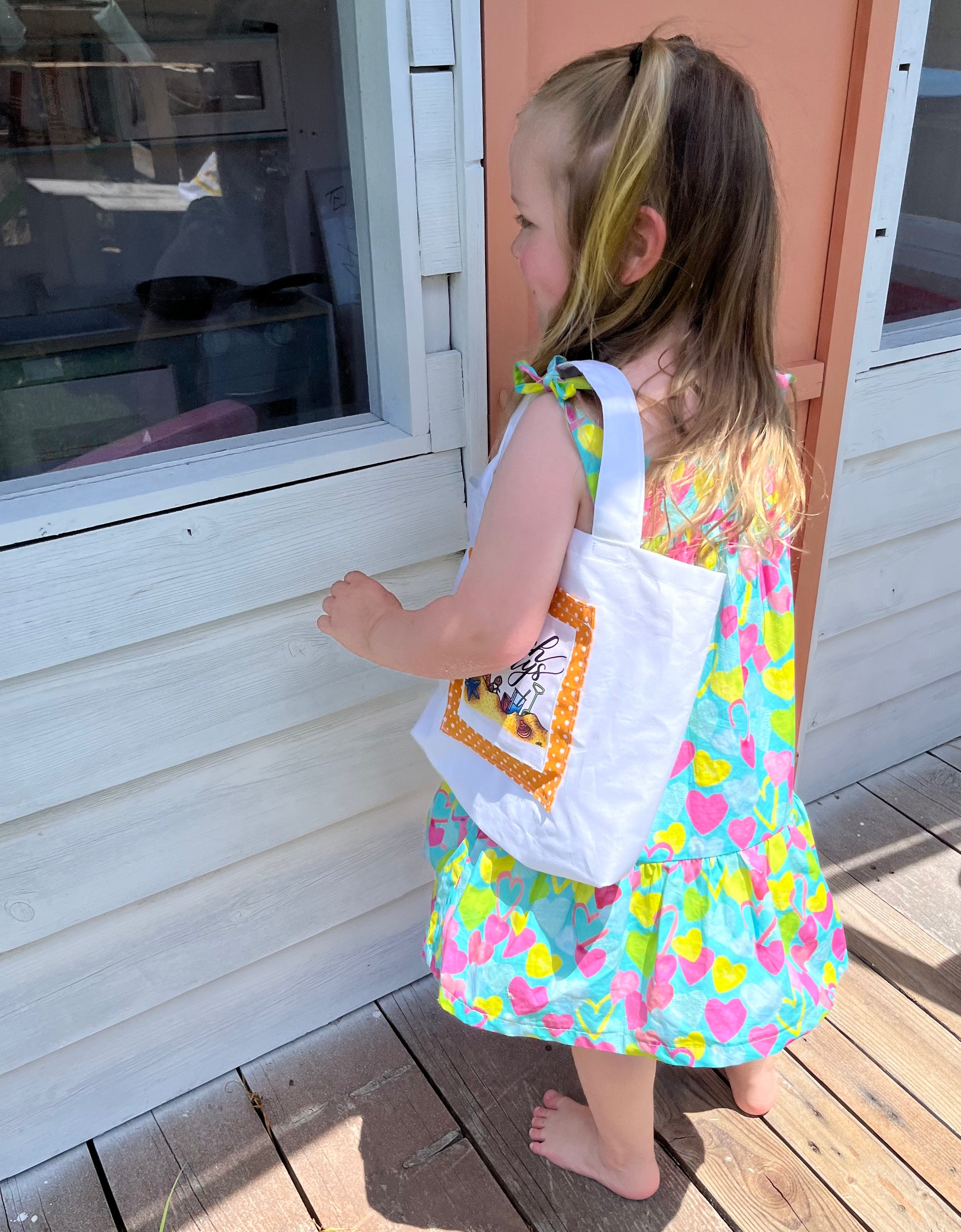 These tote bags are made of polyester cotton. They wash well and are light and easy for little ones to carry!